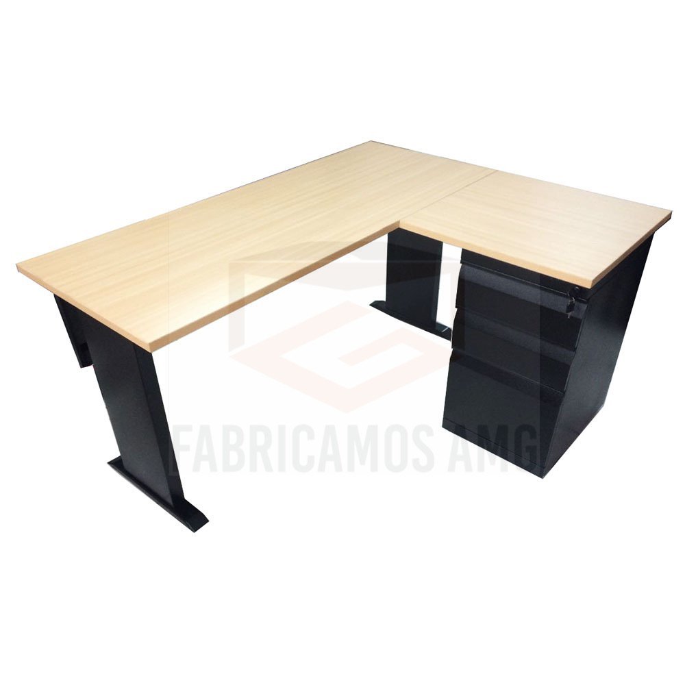 Escritorio en L con cubierta y base en melamina con niveladores regulables.